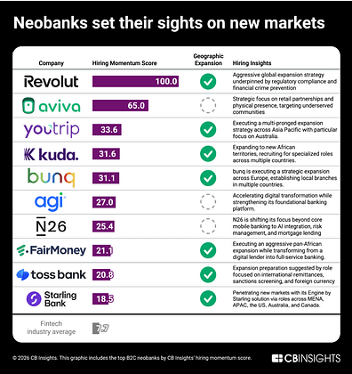 CB Insights’ hiring momentum scores highlight which B2C neobanks are preparing for geographic expansion.