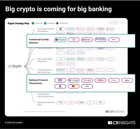 Ripple has most aggressively entered institutional banking, forging partnerships with 9 of the 100 largest traditional banks by assets since 2023, such as DBS Bank and BNY Mellon. Its strategy map from the past year shows 4 acquisitions across treasury management fintech, prime brokerage, and B2B cross-border transactions processing to build out its financial stack: