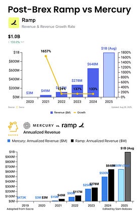 With Brex's $5.15B exit to Capital One, the private B2B finance landscape is now defined by Ramp at $1B in annualized revenue (up 110% YoY) expanding from cards & expense management into treasury & deposits, versus Mercury at $650M in annualized revenue ($248B transaction volume, up 59% YoY) expanding from startup banking into the finance backoffice with corporate cards, bill pay & expense management. While HR & payroll leader Rippling ($570M ARR in February 2025, up 52% YoY) offers corporate cards and has pushed into the finance back office with travel, expense management & bill pay, its dogfight with Deel ($1.3B annualized revenue in 2025, up 63% YoY) over domestic & global payroll plus the operationally & people-intensive nature of the payroll business circumscribes its ability to stay aggressive & on the offensive to crossover the payroll / non-payroll expense boundary.