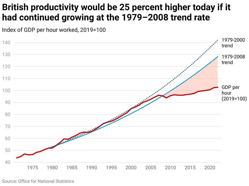 Brexit and Covid obviously haven’t helped (nor have the Truss, Boris, or Sunak govts since then), but I don’t think this grapples with the performance of the British economy from the mid-2000s onward, which has basically flatlined in productivity terms for twenty years.