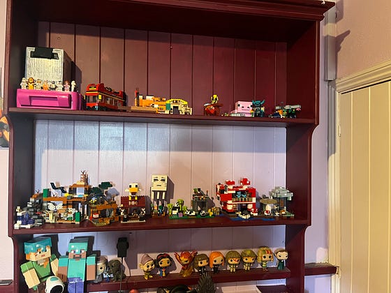 The moment your eldest takes over your bookshelf and turns it into a Lego Minecraft world. 🥰