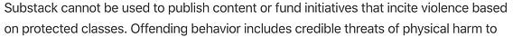 Of course “incitement to violence” is the legal standard! It’s the legal standard because Substack is a private corporation and those are its binding terms of use. If you want to have this enormous, destructive debate about whether Substack is abiding by its standards of discourse or not, then it might make sense to start with what its actual standards are.