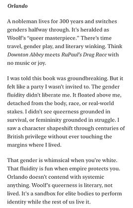 there’s a big ragebait piece on here that’s been doing the rounds, in which the author, who is notionally a black woman, writes about hating virginia woolf. the argument for why virginia woolf is bad essentially boils down to “she’s white, i’m not, therefore her books exclude me.” deeply silly stuff, and hundreds of people have got very …