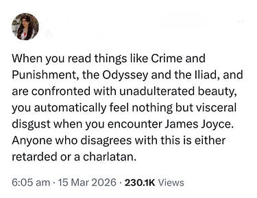 every time i encounter one of these maniacs i want to ask them to give an example of a passage in the iliad or the odyssey that they find particularly beautiful. is it the bit where someone has his head perforated by a spear, “shattering his white teeth, shearing his tongue at the root, and exiting through the chin”? is it the millionth time the poet mentions the “rosy-fingered dawn”? there’s something enjoyable in the rolling repetitive cadences of the homeric poems but on the level of the actual language they’re not remotely beautiful, beauty is not their project, there’s nothing comparable to the self-conscious aestheticism of someone like keats or even later greek poetry. it’s oral literature, rough-hewn, half-savage, which is precisely why it’s still so fascinating today. similarly, what’s the most beautiful passage in crime and punishment? dostoevsky’s writing is basically monstrous, heavy and hysterical, shrieking old women who turn white or purple every other paragraph. absolutely none of the deeply musical qualities of joyce. nothing nearly as nice as stephen on the strand. “signatures of all things I am here to read, seaspawn and seawrack, the nearing tide, that rusty boot.” or the line about heavy sands i’ve stolen for my tagline. but of course this person hasn’t actually read any of the texts they mention, it’s all just a rote fetishistic invocation of the jordan peterson bookshelf of beautiful classical wisdom. fucking dostoevsky! “unadulterated beauty.” you are an illiterate. fuck off