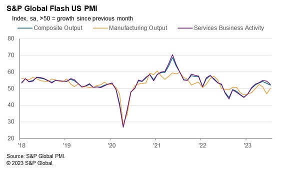 S&P Global Flash US PMI: “The overall rate of output growth, measured across manufacturing and services, is consistent with GDP expanding at an annualized quarterly rate of approximately 1.5% at the start of the third quarter.” pmi.spglobal.com/Public…