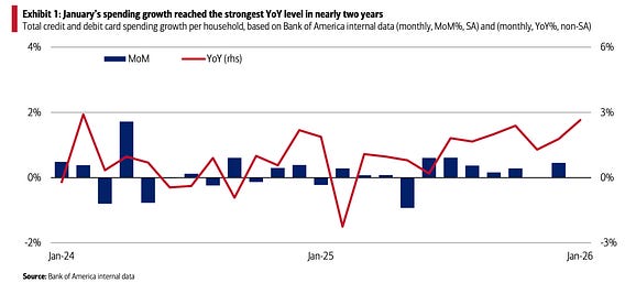 💳📈"Consumer spending showed solid resilience in January, with total card spending rising 2.6% year-over-year (YoY) — the strongest pace in nearly two years..." - BofA card data