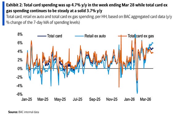 💳BofA: "Total card spending was up 4.7% y/y in the week ending Mar 28 while total card ex gas spending continues to be steady at a solid 3.7% y/y"