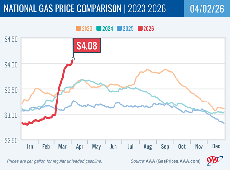 "The national average for a gallon of regular exceeded $4/gallon this week for the first time since August 2022. Today’s average of $4.08 is ten cents higher than last week and $1.08 higher than a month ago." - AAA