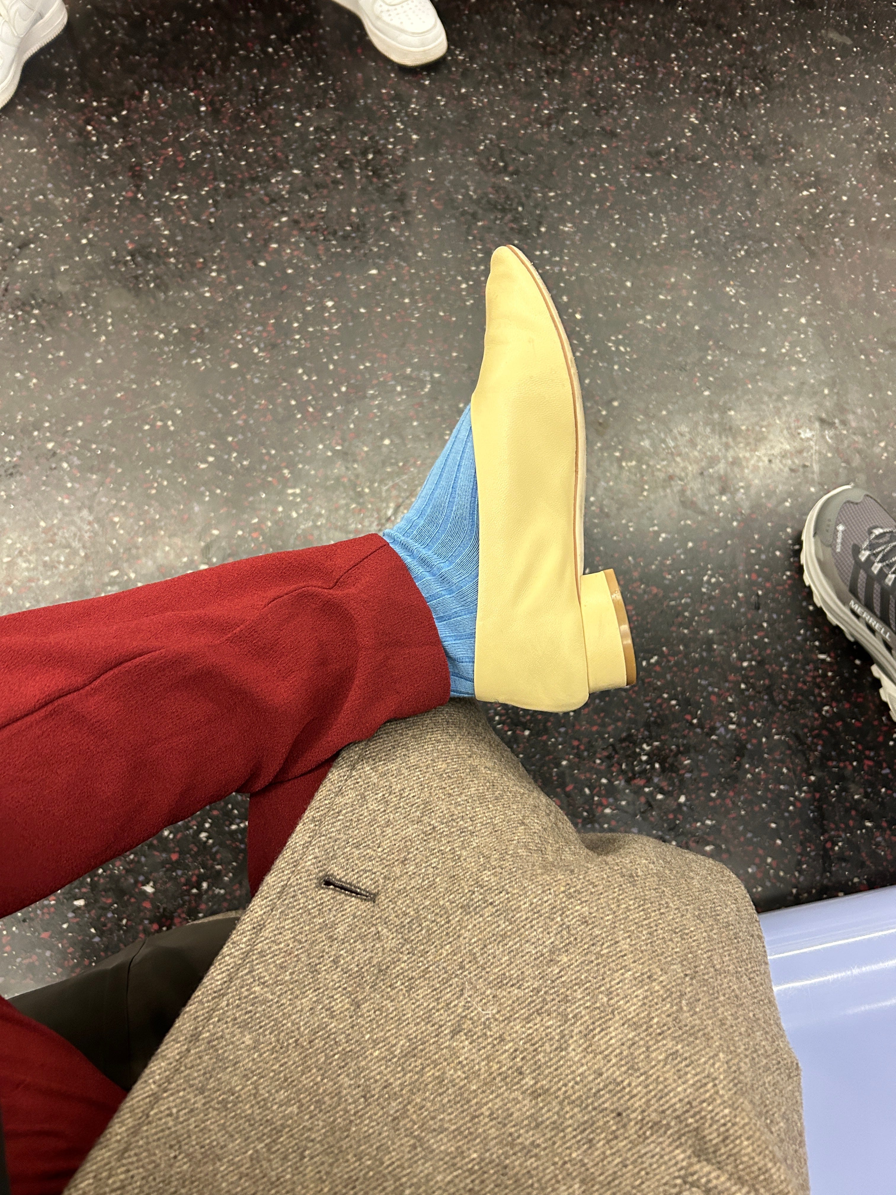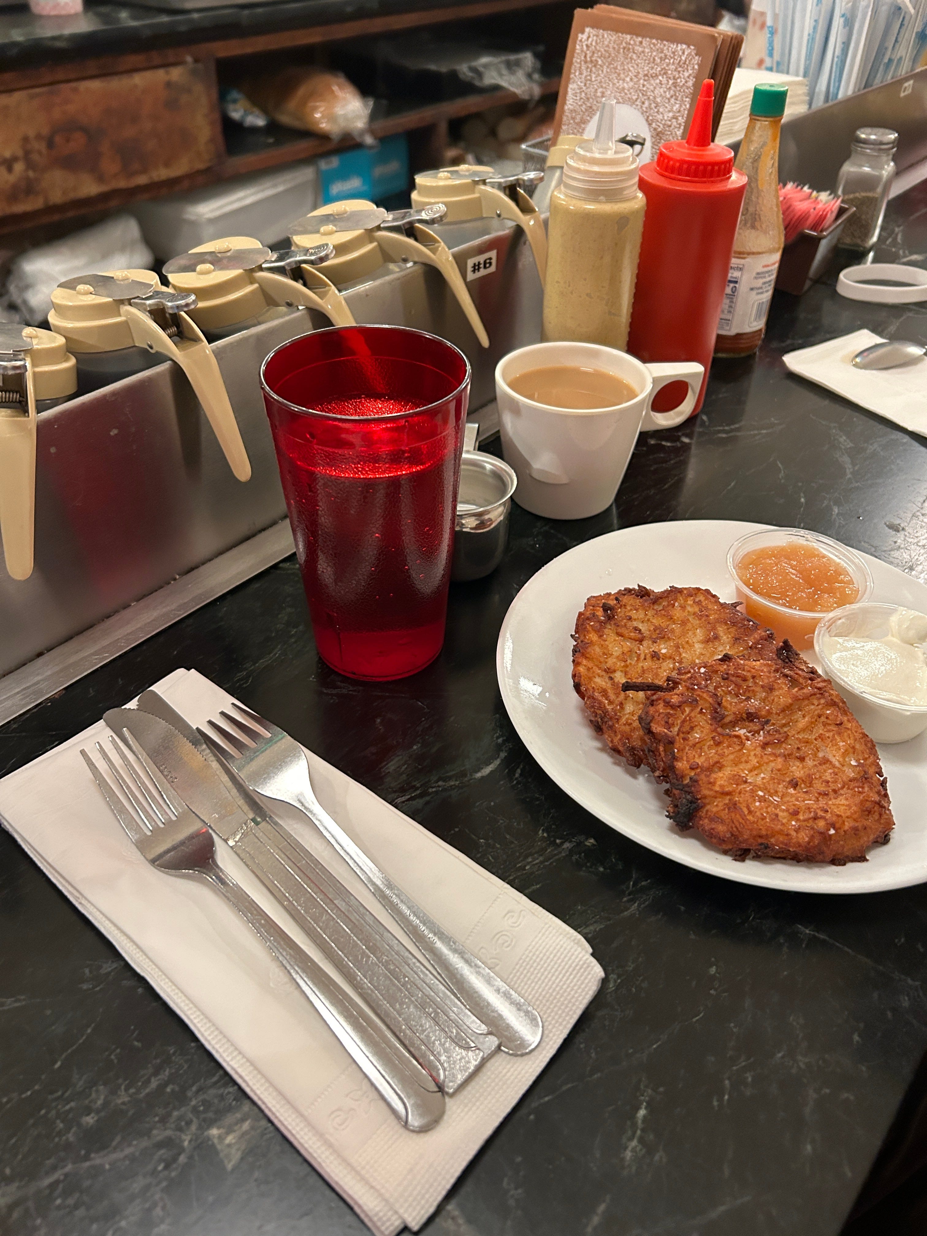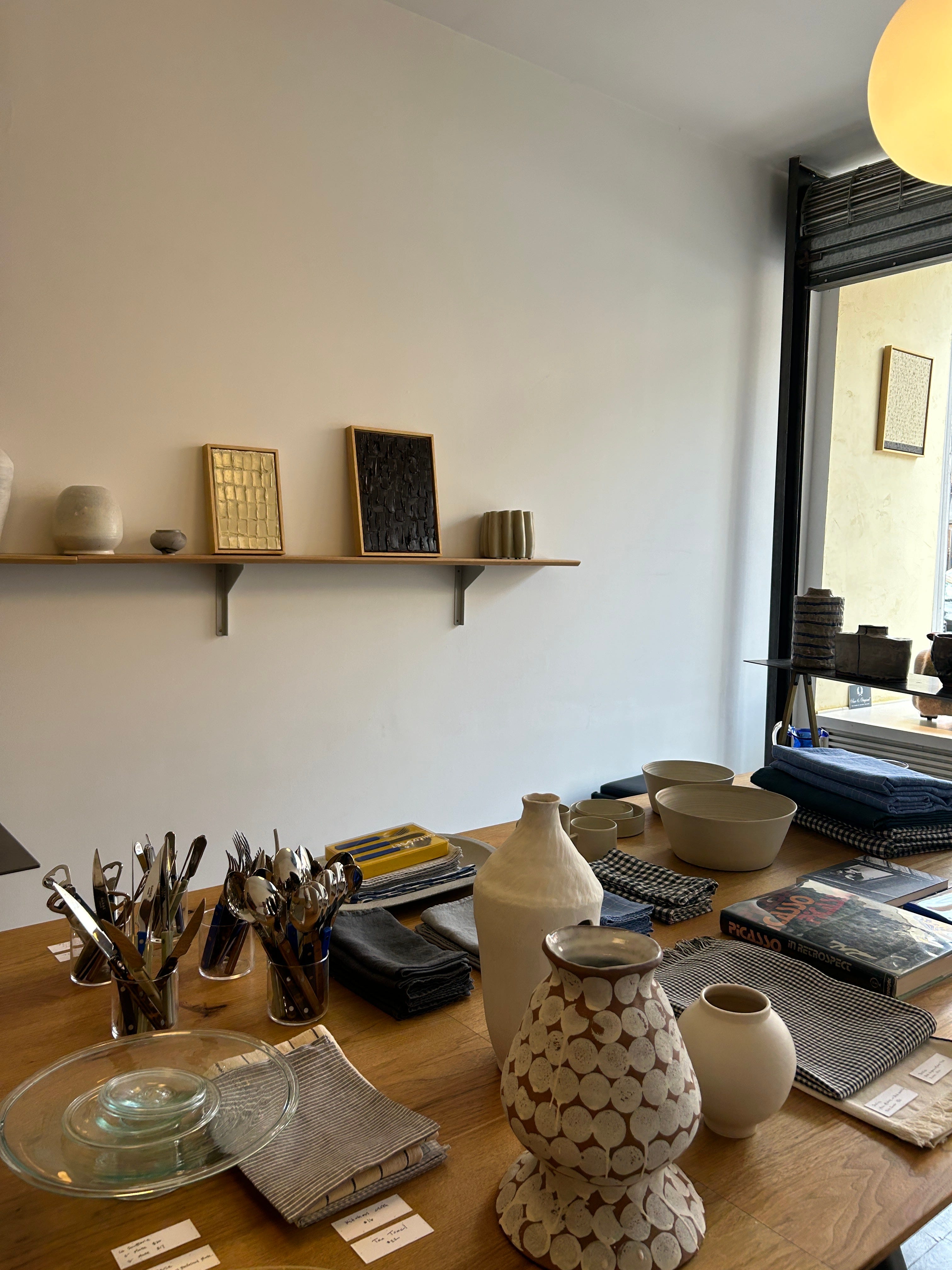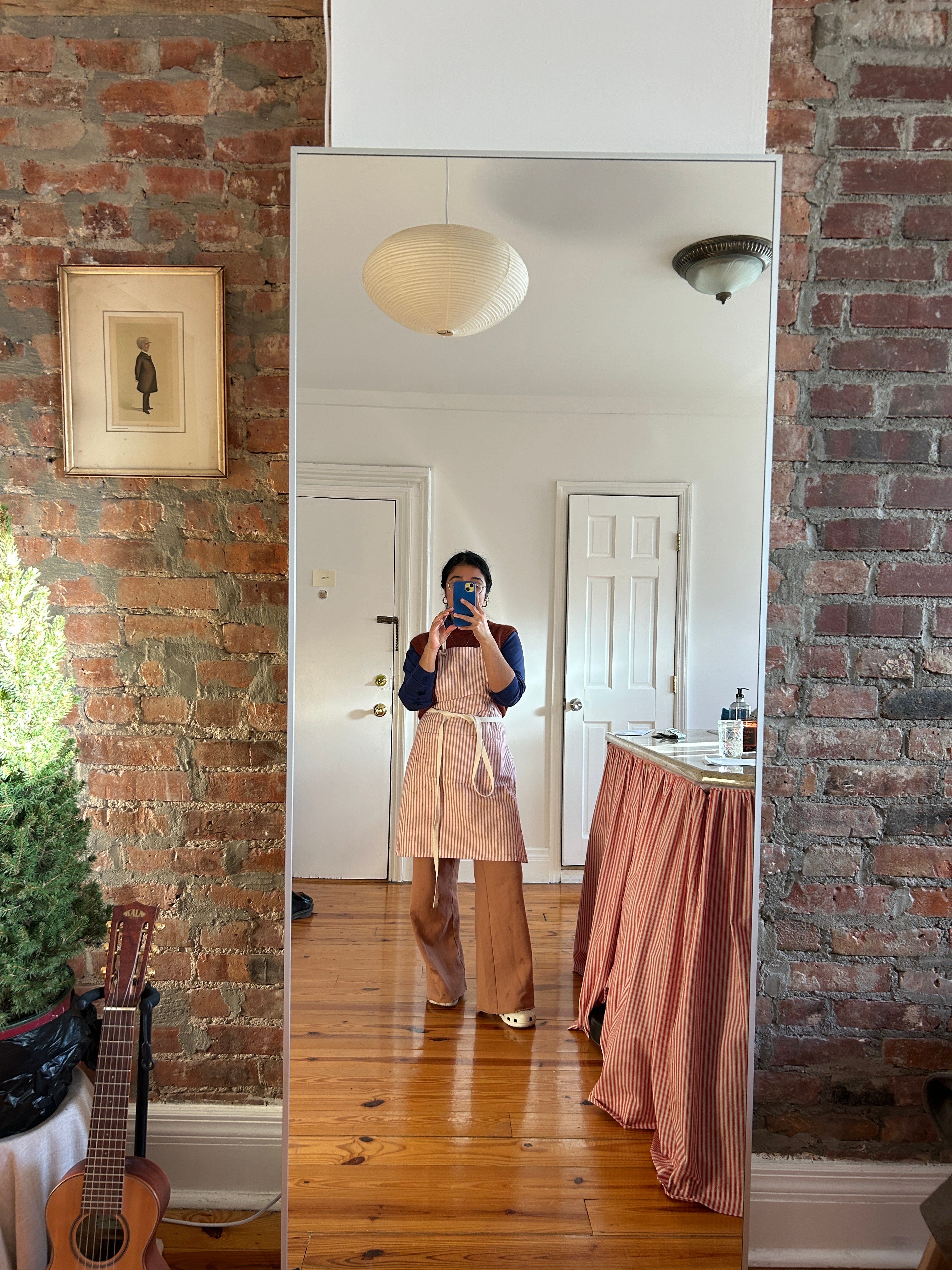 Slow January days: window shopping around the neighborhood, reading my book on psycho-decorating, olive oil cake, my striped apron, go-to shoes, yummy latkes