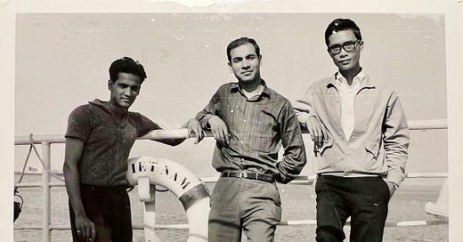 That’s my father in the middle, with a couple of travel companions on the ship that brought him from India to London. It was the 1960s, I wasn’t born yet, and he wasn’t married. Just a young man heading west, as I would decades later, from London to LA, at around the same age, too, about 29 or so. Who can explain these symmetries? Like history, families rhyme too.