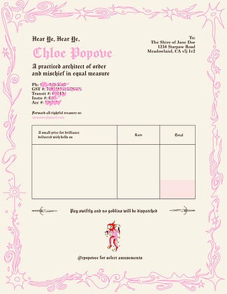 By decree of no governing body whatsoever, I announce a minor administrative revolt. I have redesigned my personal invoice. In my unsolicited opinion, professionalism and whimsy are not mutually exclusive. If thought is rendered and coin is exchanged, the ledger should be a pleasure to issue and a pleasure to settle. Designed by the steady hand and signature sparkle of Sarah Jane ⭐️