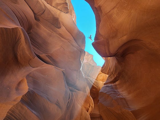 I took this photo from inside a slot canyon. I had no idea the bird was there until I saw the photo later.