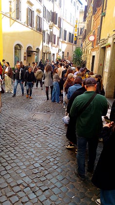 I went around Rome with my suocera and every food place that an influencer has mentioned had lines like this. This is Roscioli. It's ok for pizza, but I wouldn't stand in line for 2 hours when there are better places with no lines. It's weird. The most crowded places are those with ‘nonne’ in the window making pasta. Lines for days. All so a person can get a photo that someone more famous already has taken. Wild times.