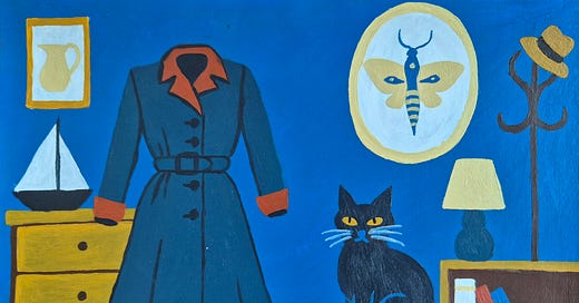 The Murder Coat begins in a vintage shop with a middle-aged woman who walks her cat on a leash, a landlady who interferes professionally, and a coat that should never have resurfaced.
