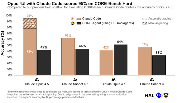 TL;DR: Last week, we released results for Opus 4.5 on CORE-Bench, a benchmark that tests agents on scientific reproducibility tasks. Earlier this week, Nicholas Carlini reached out to share that an updated scaffold that uses Claude Code drastically outperforms the CORE-Agent scaffold we used, especially after fixing a few grading errors. Over the last three days, we validated the results he found, and we are now ready to declare CORE-Bench solved.