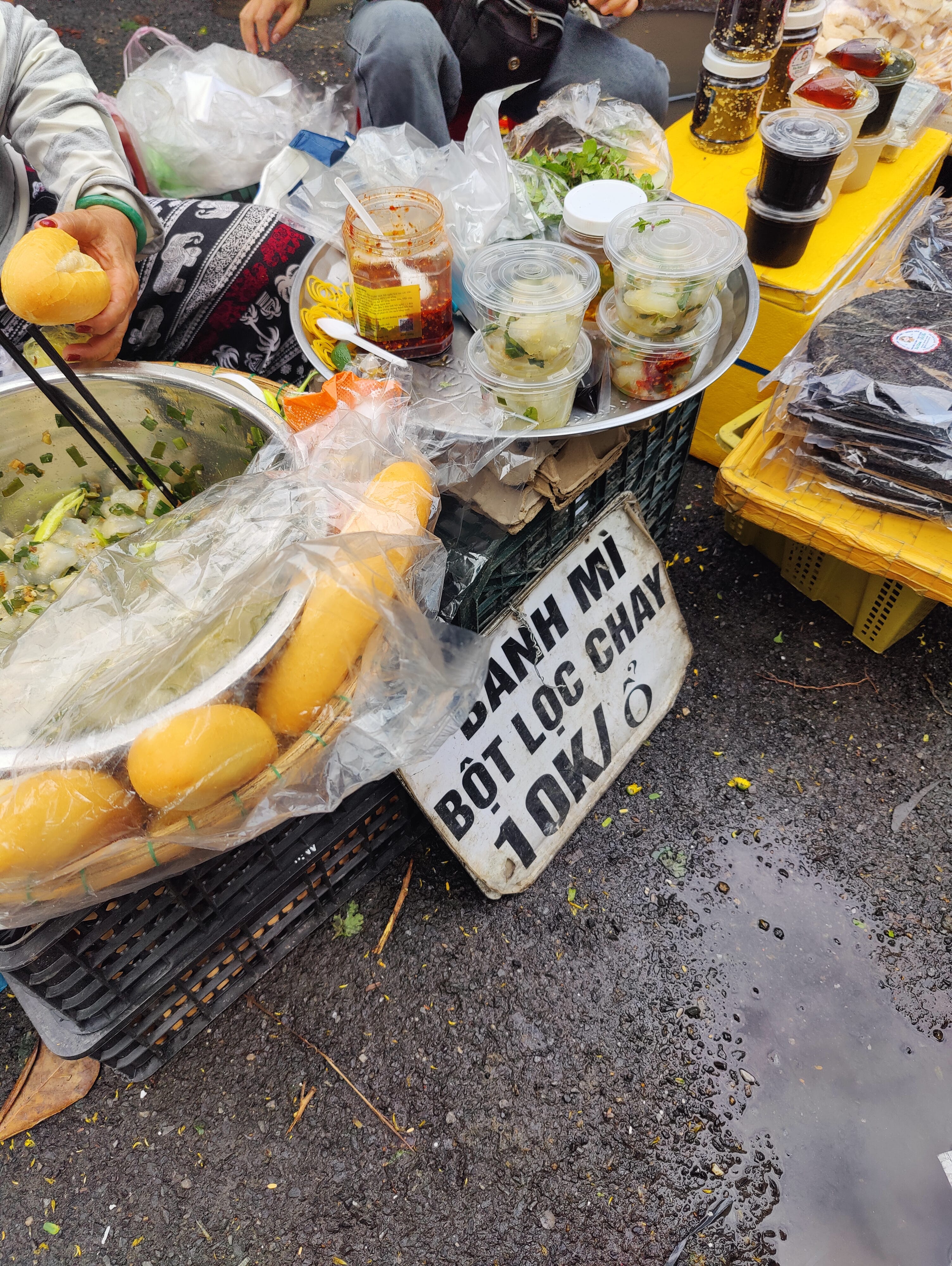 plus, tall asparagus (lighter in color, here), fried tofu, freshly baked Uzbek bread and a bánh mì bột lọc chay filled with steamed, chewy, delicious and intriguing filled tapioca dumplings, herbs, chili sauce, and greens.