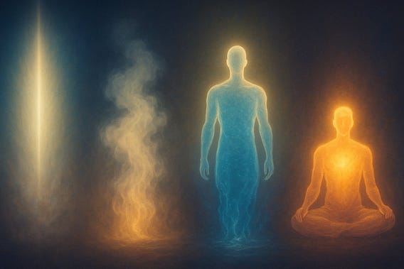Like the various forms of water (steam, ice, water), the body is simply a form factor of the same underlying thing - consciousness.