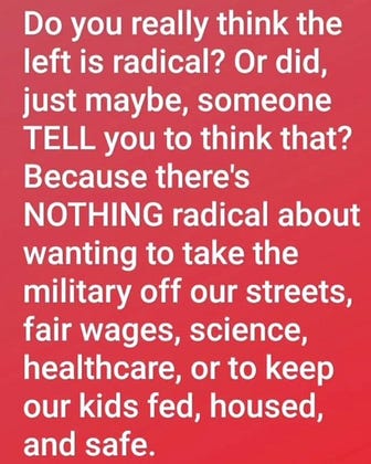 We repeat - there’s NOTHING radical about wanting to take the military off our streets, fair wages, science, healthcare, or to keep our kids fed, housed, and safe.