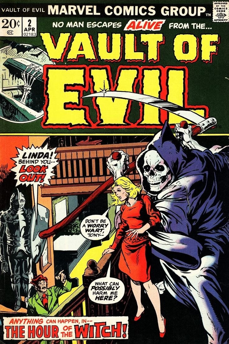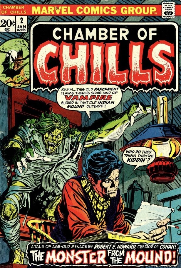 MARVEL HORROR COMICS - 1970S - My parents weren’t visual arts people, they were music people. I was starved for imagery growing up. Luckily for me, a lot of families had a stack of comics & if I was really lucky they had some horror titles mixed in with the Archie, Spider-Man, Porky Pig & whatever other 70s books they had lying around. The heyday of horror comics was in the 40s & early 50s but due to fifties moral panic over comic books (amongst other things) the industry made their own Comics Code in 1954, & the horror titles in particular we’re neutered & never recovered. Fast forward to the freewheeling seventies & how they bled into the 80s. By this time comics had been thoroughly relegated into the “dumb kids stuff” world, but there were still gems & they had figured out how to push the comics code as much as they could. Marvel comics made a huge number of horror titles, many of them emulating the Horror Comics magazines (like Eerie) which in turn were a copy of the old pre-code EC comics (like Tales From the Crypt) (which if you want to go further were the comics versions of the pulps). The main thing I remember about seventies comics is that they had this weird energy to them, like a men’s bathroom at a gas station in the middle of nowhere. They tried to control the natural disgusting state of the human male left to their own devices with a urinal cake…