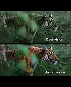 Humans are trichromats, meaning we have three types of photoreceptors (red, green, blue).The tiger’s prey (deer and boar species) are typically dichromats that struggle to see reds and oranges, which will often appear as a dark grey, brown, or green color.