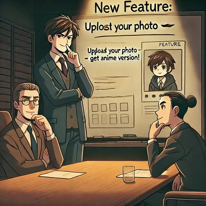 🤵 Exec 3: 🤔 Hear me out. We offer a tool that transforms a personal photo into an anime version. People will love it. They’ll share the results, and we’ll get a fresh batch of faces to train our AI.