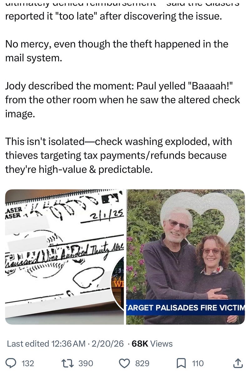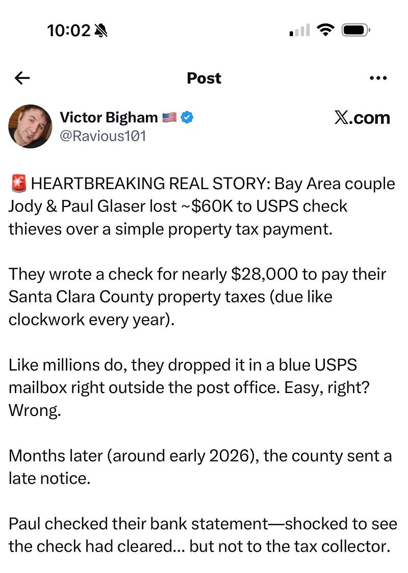 Looks to us like an inside job. Probably a USPS employee gets paid a bounty for finding envelopes with checks. Should be easy to verify with AI using check fraud reports in the area of that postal box.