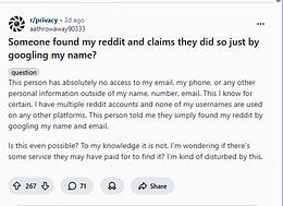 Someone on r/privacy just discovered that a person found their anonymous Reddit (allegedly with no shared usernames, no personal details posted) just by Googling their real name.