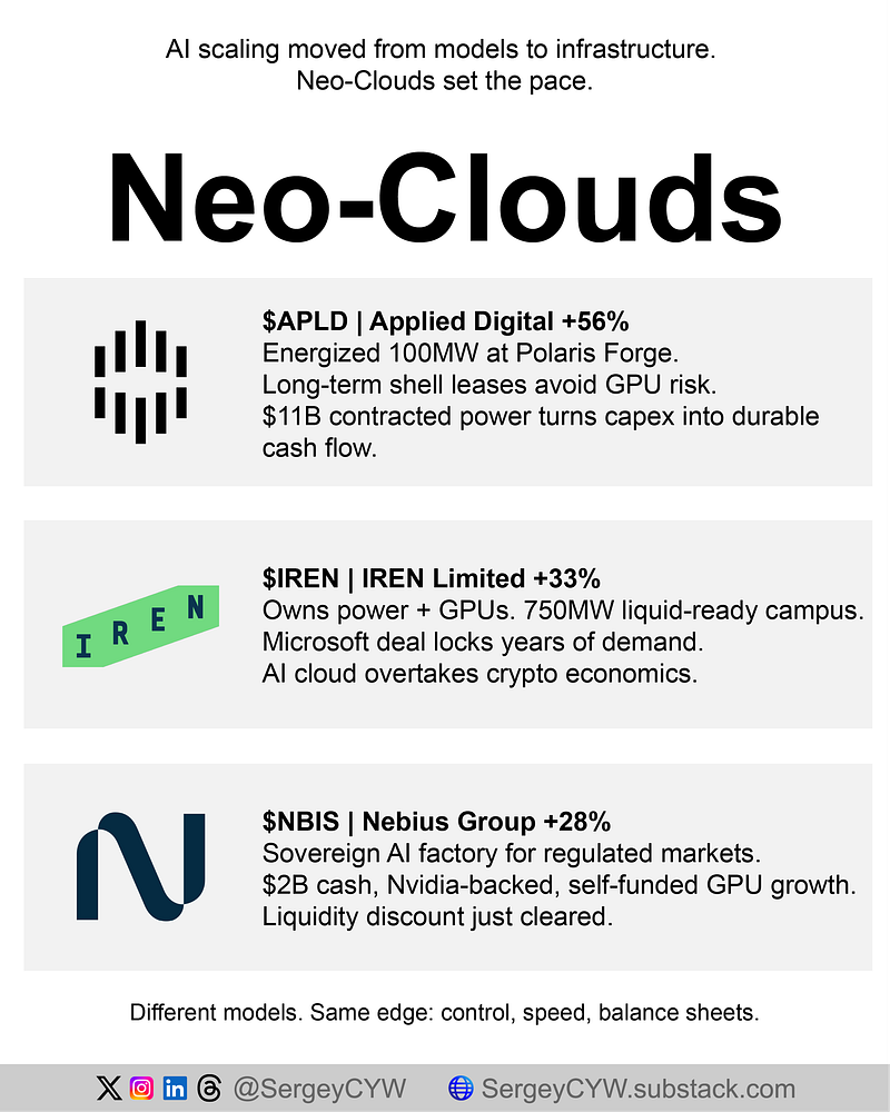 $NBIS — Nebius Nebius runs a sovereign AI factory, not commodity hosting. Proprietary orchestration software plus European data residency gives it pricing power in regulated markets hyperscalers underserve. The balance sheet matters here: ~$2B in cash, minimal leverage, self-funded GPU expansion. Nvidia’s direct equity participation validates the roadmap. Targeting $750M–$1B ARR exiting 2025, with GPUs scaling past 20k units. Liquidity discount disappeared after Nasdaq trading resumed. Mispricing still hasn’t.