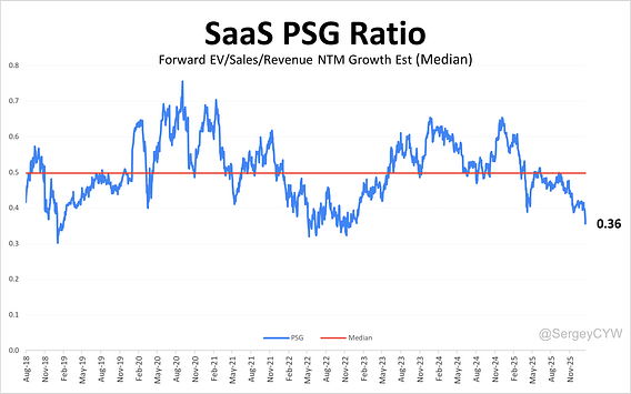 The historical chart for the median PSG multiple among SaaS companies shows a median of 0.36, near the lows of 2022 and the December 2018 low, compared with a long-term historical median of 0.5.