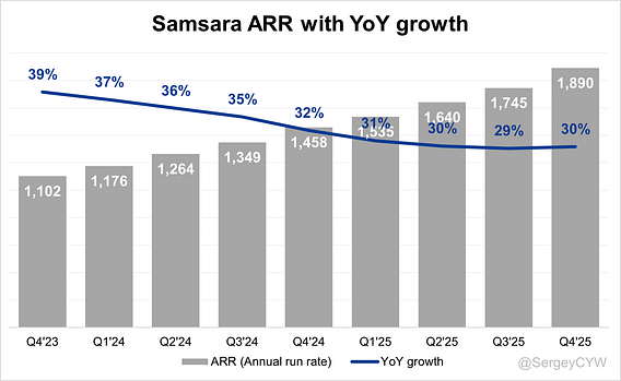 $IOT Samsara: ARR growth accelerated from 29% last quarter to +30% in Q4. Samsara added a record level of Net New ARR in its history.