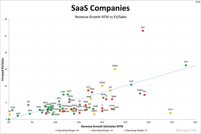 SaaS valuations based on the Forward EV/Sales multiple relative to their projected NTM revenue growth.