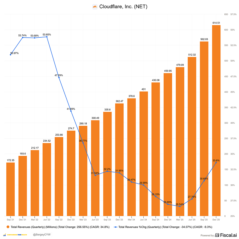 $NET is starting to reflect that demand. Revenue growth has accelerated over the last three quarters, reaching +33.6% YoY in Q4 2025.