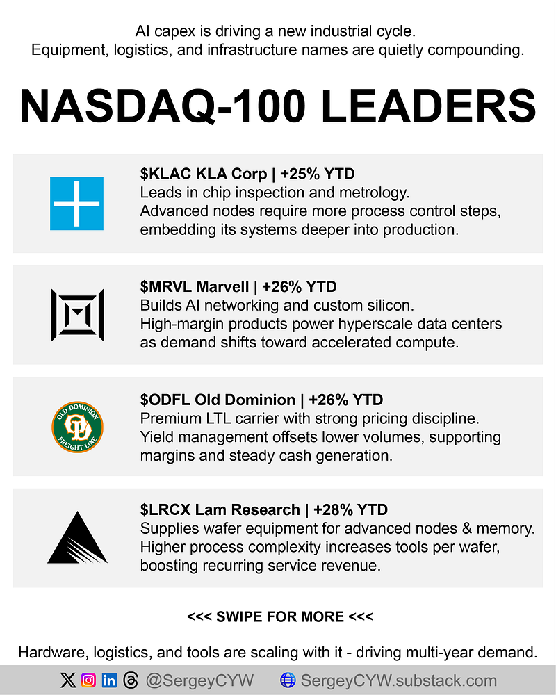 $LRCX Lam Research | +28% YTD Wafer equipment supplier. Higher process steps per chip boost tool demand. Large installed base supports recurring service revenue growth.