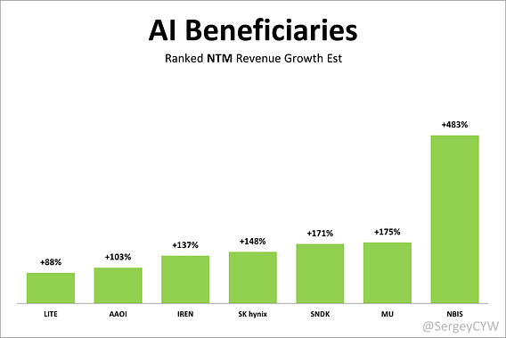 Compute, memory, optics, and power infrastructure are all exploding in demand. A few companies are showing extreme forward growth estimates.