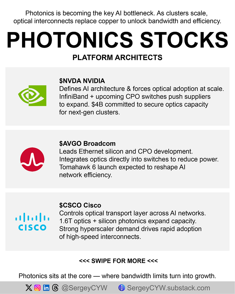 $NVDA Nvidia Nvidia sets the pace for optical adoption across AI infrastructure. Its Quantum InfiniBand roadmap is pushing 200G-per-lane co-packaged optics into 2026, forcing suppliers to scale with Blackwell clusters. Nvidia also committed $4B into the optical supply chain to secure lasers and transceivers. Role: platform architect. It determines when photonics moves from optional upgrade to required infrastructure.