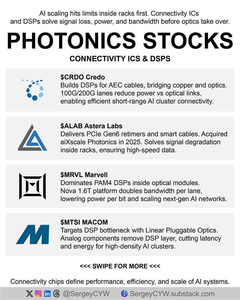 $CRDO Credo Credo bridges copper and optics through DSPs and Active Electrical Cables. Revenue reached a record $407M in one quarter, while non-GAAP gross margin climbed to 68.6%, showing strong economics in AI connectivity. Its 100G and 200G-per-lane solutions let hyperscalers use lower-power AEC links for short-reach inter-rack connections. Role: signal-processing layer that reduces power before optics even become necessary.