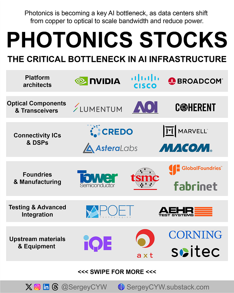 Here’s the photonics stack — from platform architects to materials suppliers — and the public stocks exposed to it.