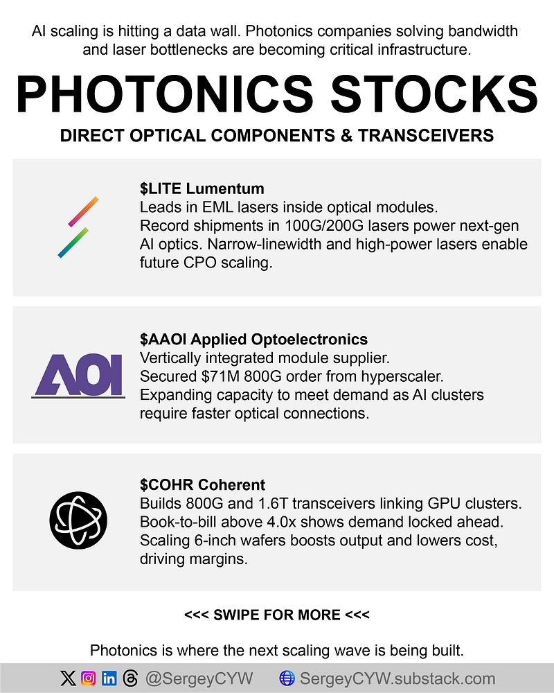 $AAOI Applied Optoelectronics AAOI is a more direct, manufacturing-heavy photonics name. It secured a new $71M order for 800G single-mode transceivers from a major hyperscaler and is expanding capacity for both 800G and 1.6T modules. Vertical integration matters here because customers want immediate scale, not just design wins. Role: transceiver assembler and laser supplier capturing near-term AI networking demand as clusters scale out.