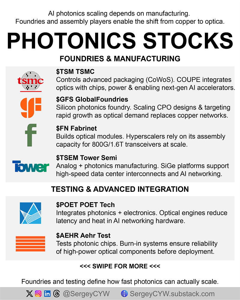 $GFS GlobalFoundries GlobalFoundries is becoming a serious pure-play silicon photonics foundry. It doubled full-year silicon photonics revenue to above $200M and secured a CPO design win for AI scale-up networks using its CLO platform. Management sees this segment nearly doubling again in 2026, aiming for a $1B run-rate by 2028. Role: specialist foundry translating silicon photonics designs into scalable production.