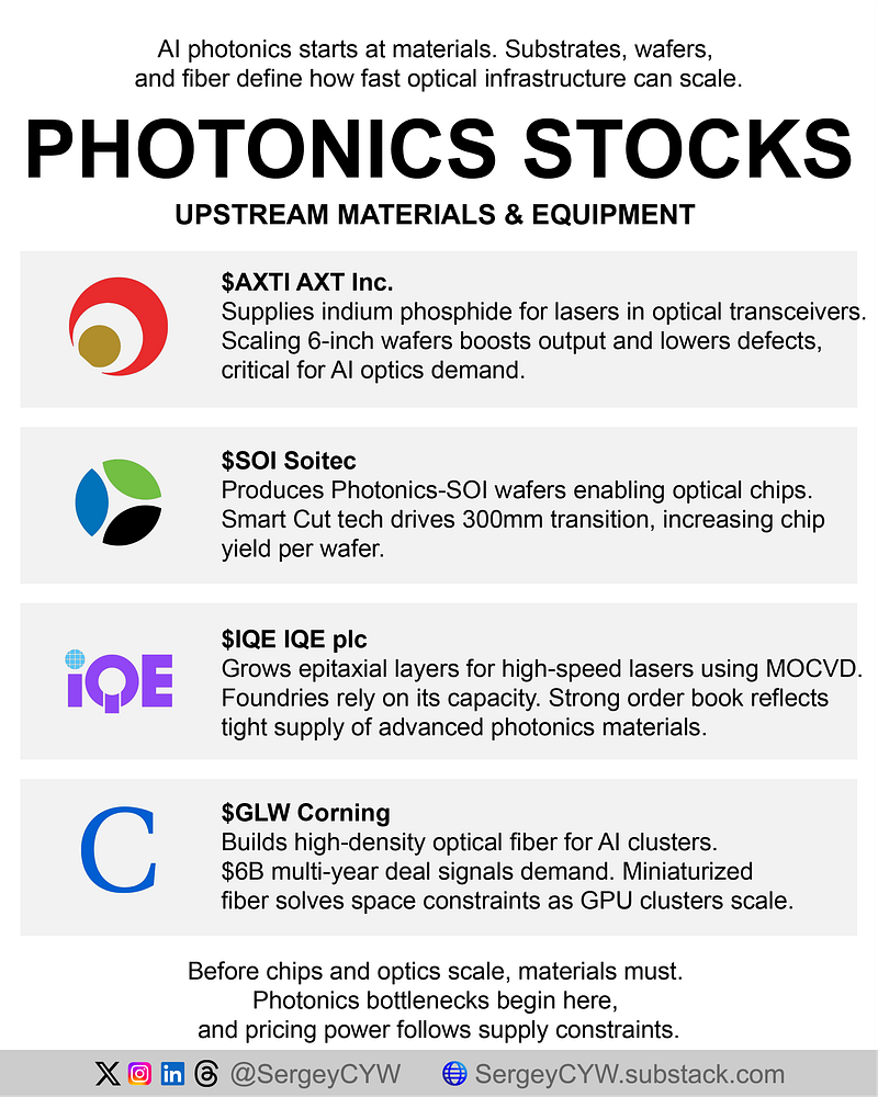 $AXTI AXT Inc. AXT provides indium phosphide substrates, a foundational material for lasers used in high-speed optical transceivers. Q4 2025 indium phosphide revenue reached $8M, while backlog climbed above $60M. Management already increased capacity 25% and plans to double it by the end of 2026 through 6-inch wafer expansion. Role: raw-material bottleneck supplier. No indium phosphide, no laser scaling.