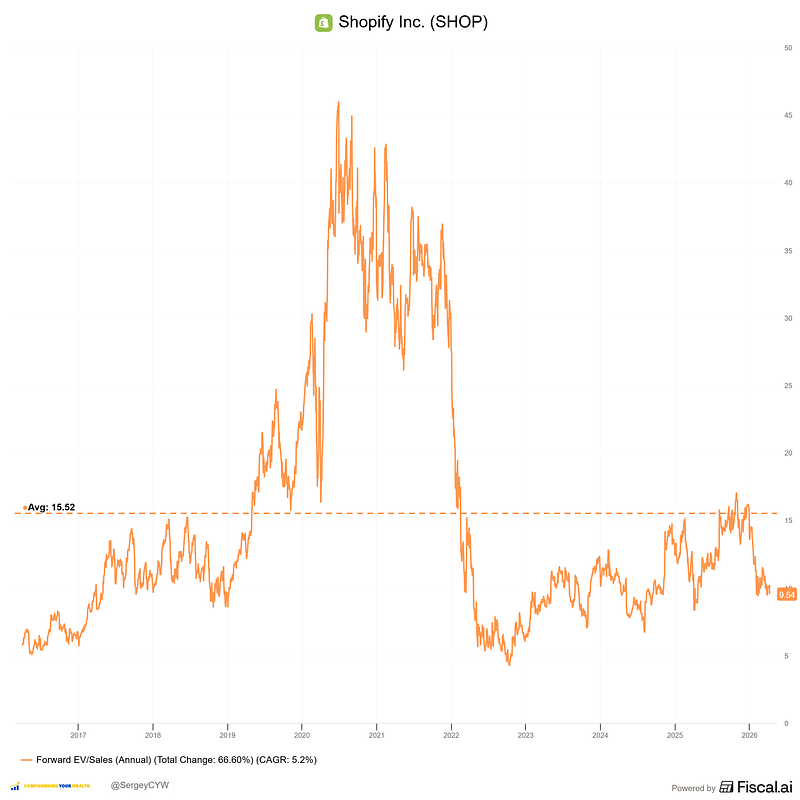 $SHOP — Shopify | Forward EV/S: 9.5x Shopify is embedding AI directly into merchant productivity. Sidekick and Shopify Magic reduce friction for store creation, product content, and back-office operations. In only three weeks, Sidekick generated nearly 4,000 custom apps, created 29,000 automations, and edited over 1.2M product photos. Orders coming from AI search channels have risen 15x since January 2025. Bull thesis: AI lowers the barrier for new merchants and increases operating leverage for existing ones, pushing more GMV and merchant retention into Shopify’s ecosystem.