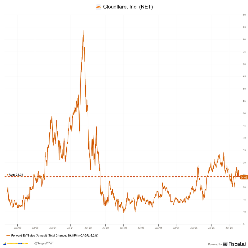 $NET — Cloudflare | Forward EV/S: 24.05x Cloudflare benefits from AI in a different way than hyperscalers. It runs workloads at the edge through Workers AI and charges for execution, not GPU rental. Management says its design can deliver up to 10x workload efficiency per processing unit versus traditional cloud approaches. AI traffic rising across search, agents, and inference can convert into higher usage without matching capex intensity. Bull thesis: Cloudflare monetizes AI demand through network density and software economics, turning edge inference into a structurally scalable revenue stream.