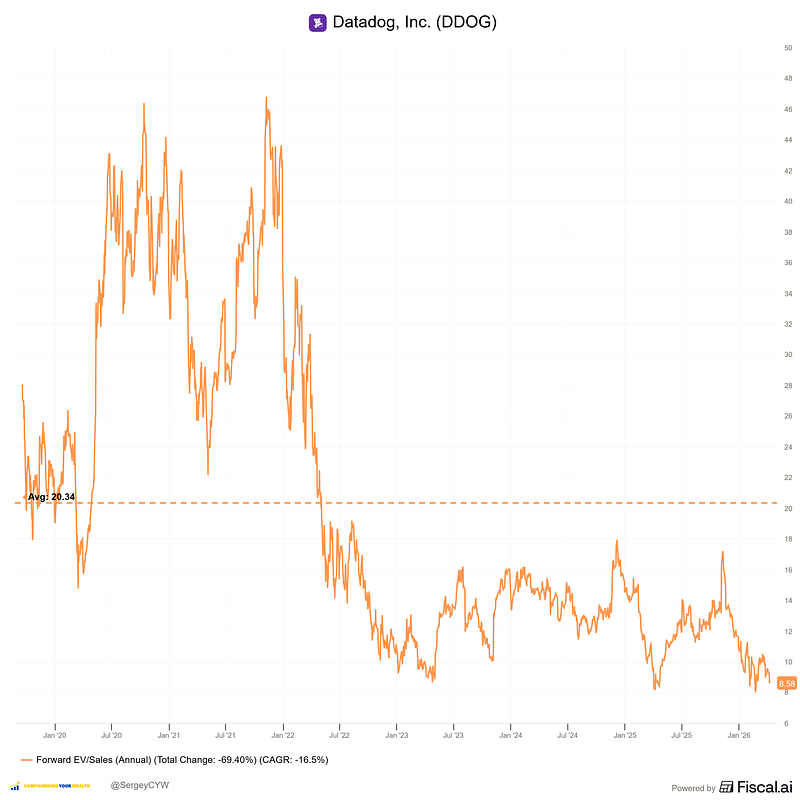 $DDOG — Datadog | Forward EV/S: 9.5x Datadog benefits as AI makes infrastructure harder to observe, secure, and optimize. Its Bits AI SRE agent helps enterprises monitor model performance, system reliability, and cost efficiency across AI deployments. In Q4 2025, Datadog posted a record $1.63B in bookings and ended the period with 603 customers generating more than $1M in ARR. It also launched over 400 new features in the last year. Bull thesis: more AI in production creates more telemetry, more complexity, and more need for a unified observability layer.