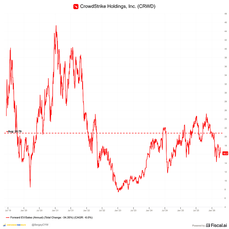 $CRWD — CrowdStrike | Forward EV/S: 16.2x CrowdStrike is turning AI into a platform multiplier, not a feature. Charlotte AI is being used to automate threat hunting, exposure analysis, and investigation workflows. In fiscal Q4 2026, Charlotte usage increased 6x YoY, and ARR tied to the assistant tripled. Net new ARR hit a record $330.7M, while 50% of subscription customers now use six or more modules. Bull thesis: AI improves analyst productivity, which strengthens platform consolidation, module adoption, and long-term customer value.