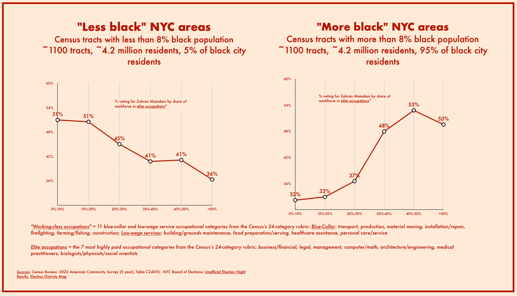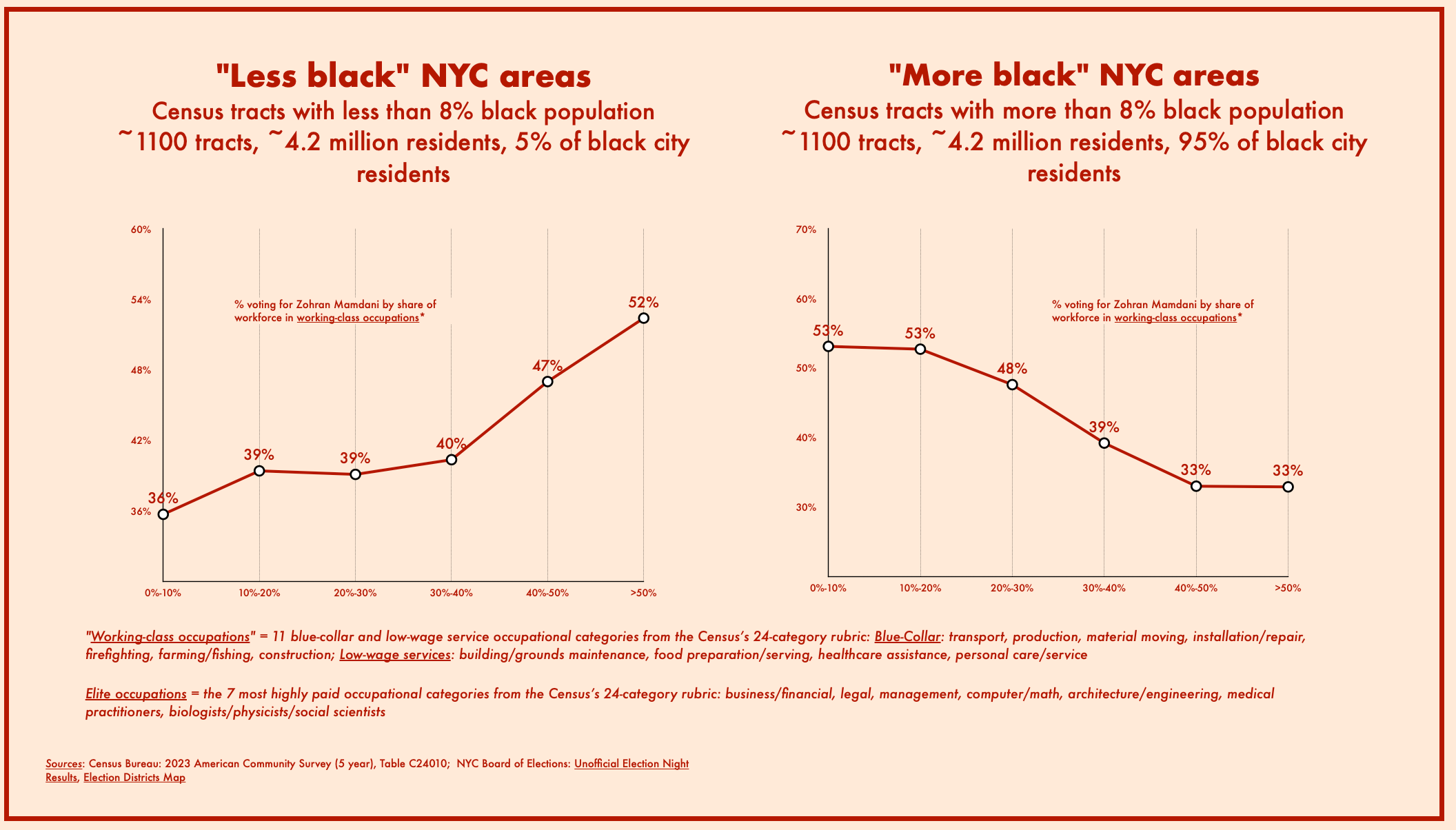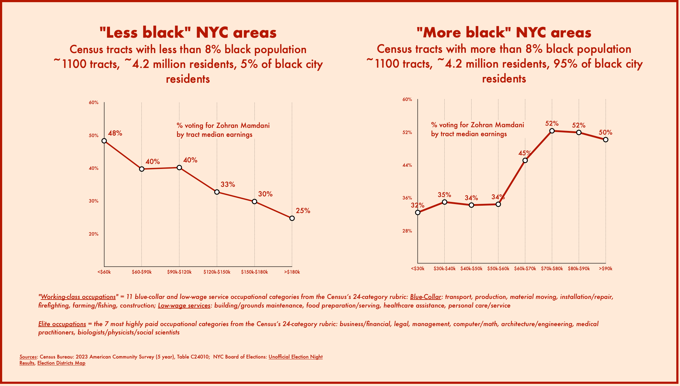 If you split New York City’s 2,168 Census tracts into two equally populated halves, based on their black population shares — a “blacker” half and a “less black” half — the pattern of class support for Mamdani turns out to be almost exactly the opposite in the two halves.