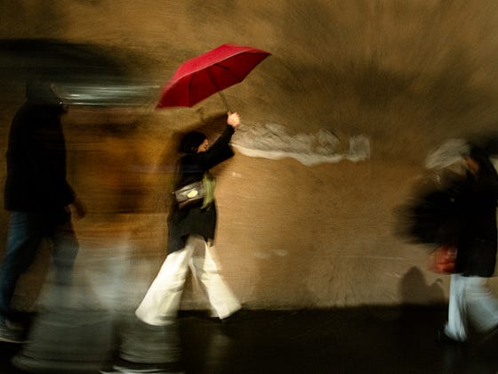 So much depends upon a red umbrella, glazed in rainwater, over the white pants in Rome.