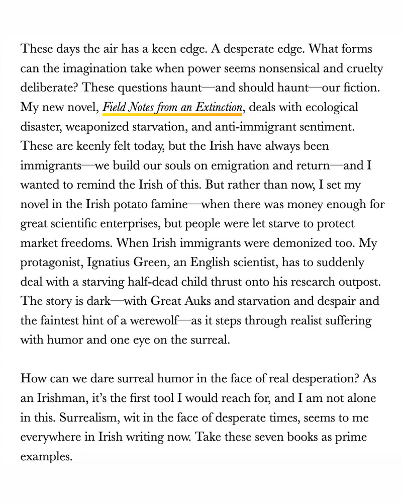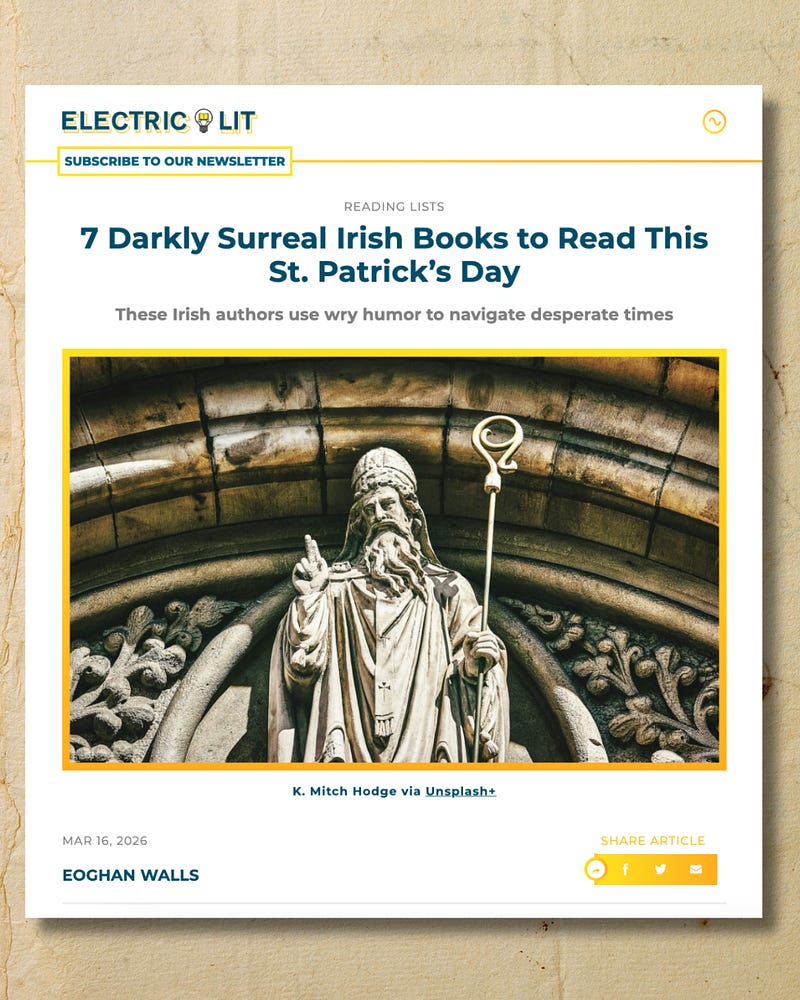 Happy St. Patrick’s Day! To celebrate, our friend Eoghan Walls has put together a list for Electric Lit of his favorite darkly surreal Irish books. As Eoghan writes, “I grew up in Northern Ireland in the 80s, when continuous sectarian hatred and state-sponsored violence seemed inevitable. The world was falling apart, so we joked about it. At funerals. In school. How could we not?”