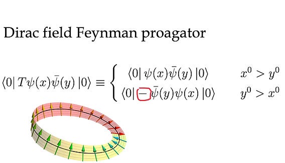 In the image is what is called the Feynman propagator, which consists of the vacuum expectation value of two fields at two different spacetime points or the probability of a particle propagating between these two points. Without this negative sign, relativity, causality, and particle physics based on perturbation theory, which in turn consists of Feynman propagators, would collapse.
