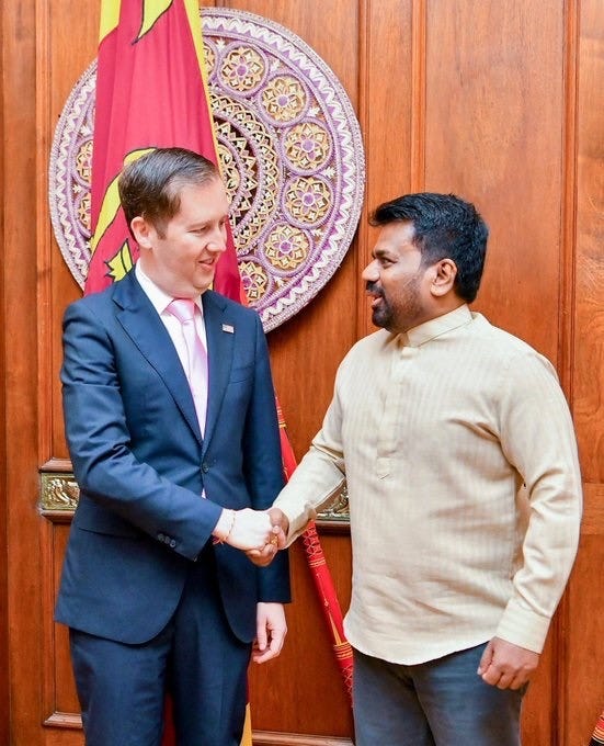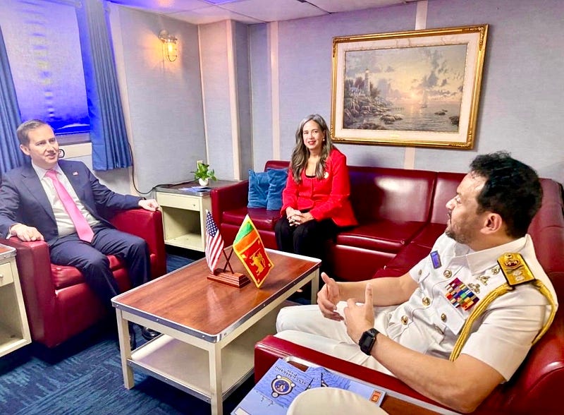 On the same day that President Dissanayake told Parliament Sri Lanka had rejected American fighter jets at Mattala Airport, and sixteen days after Sri Lanka’s Navy pulled 32 Iranian survivors from water where an American torpedo sank their ship, the US Special Envoy for South and Central Asia boarded a Sri Lankan warship in Colombo harbour.