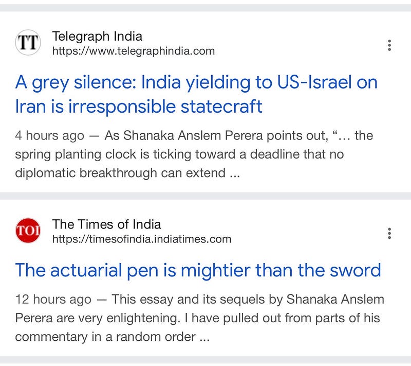 Separately, Praveen Gupta published “The actuarial pen is mightier than the sword” in The Times of India, calling the essays very enlightening and building his column around Actuarial Warfare: the argument that seven reinsurance letters from London closed Hormuz more durably than any navy could, and that markets are mispricing disruption duration by 300 percent because they are modelling a military event when the closure mechanism is financial.